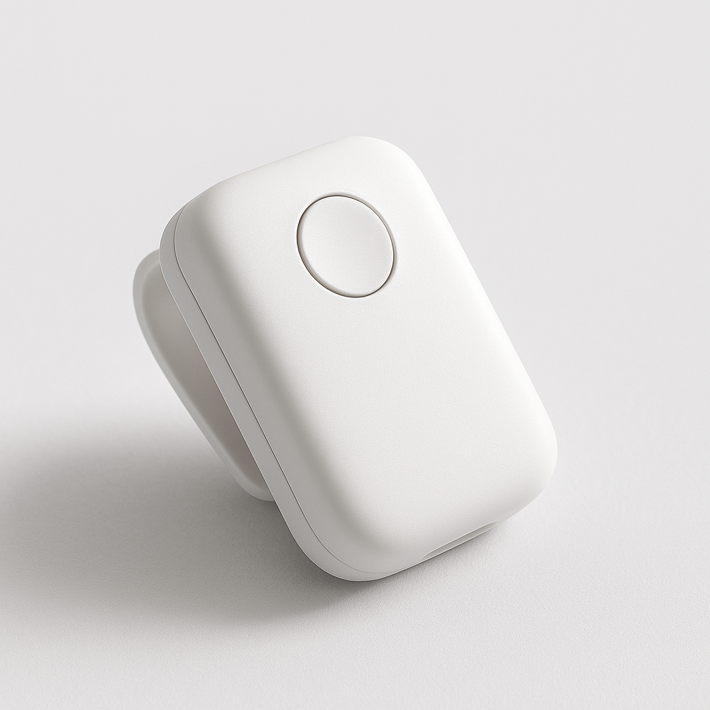 Minimalist matte white finish with soft edges and a single touch-control button. Compact and lightweight for invisible wear. Delivered in a premium recyclable box with a USB-C cable included.